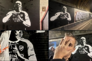 阿森纳街头艺术账号Northbanksy更新社媒,发布了新创作的壁画,埃泽身穿阿森纳球衣。